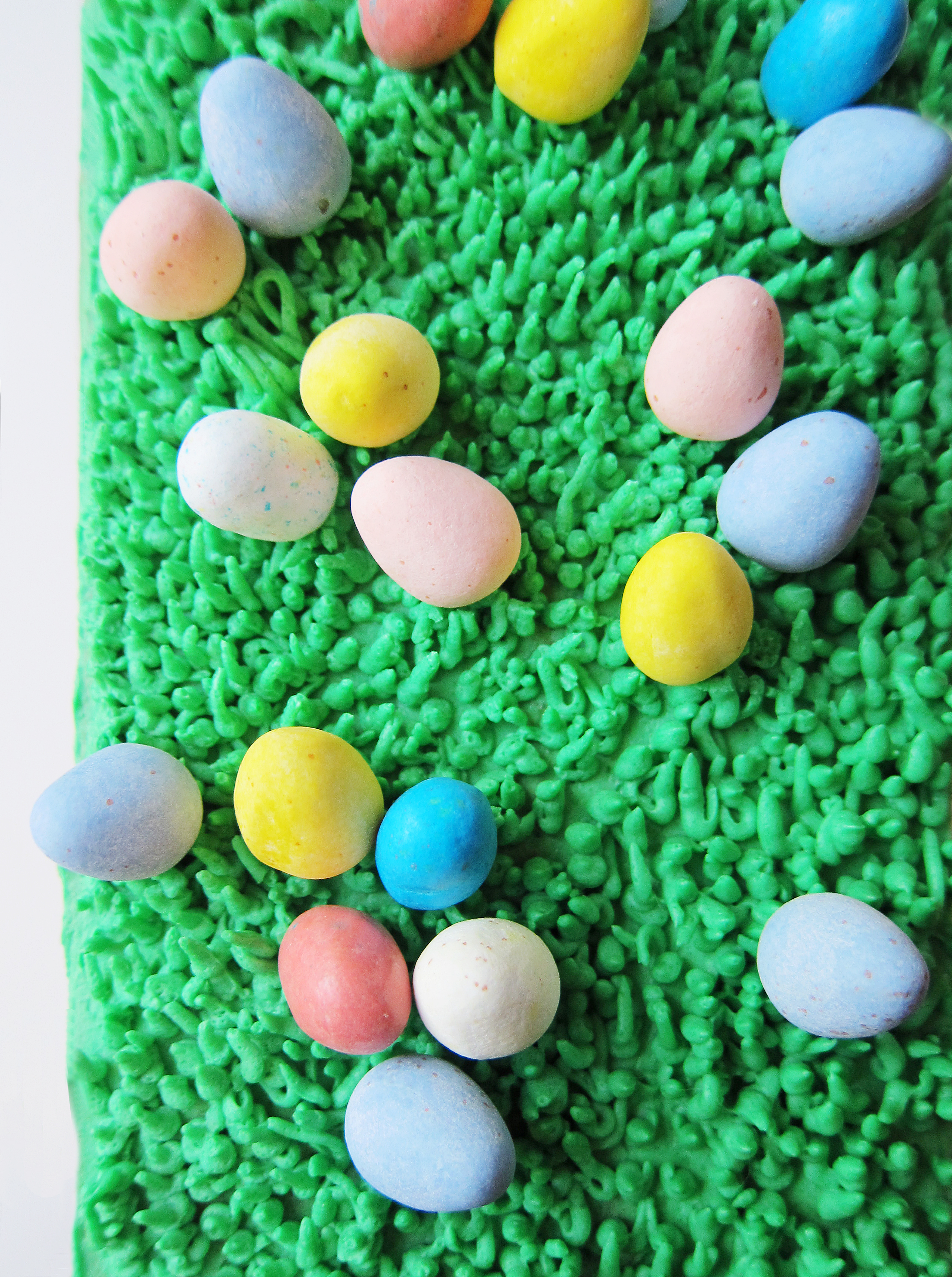 - Optional: Put the green frosting into a piping bag fitted with the grass frosting tip and pipe grass all over top of chilled cake.