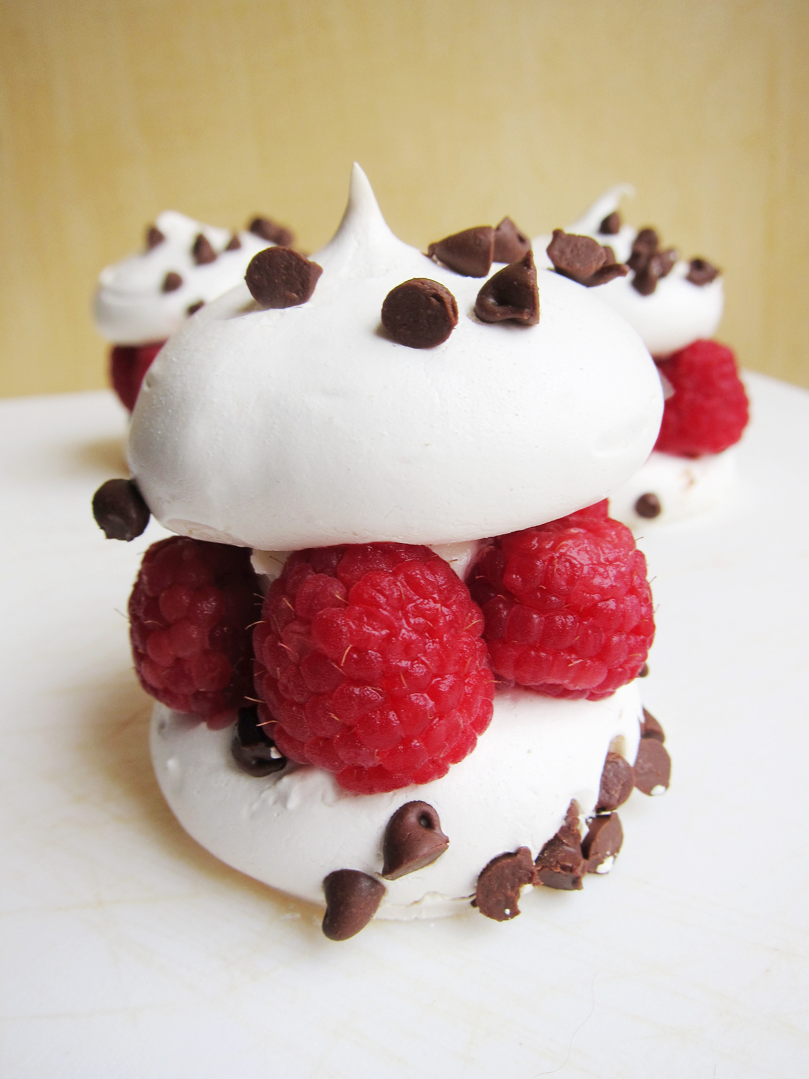 Chocolate Chip Raspberry Meringues 1Happy National Chocolate Chip Day!  Chocolate chips are such a simple concept yet so pivotal in the world of baking.  It’s so versatile and can be subbed for chocolate in a lot of recipes.  I always wondered if Ruth Graves Wakefield kicked herself for exchanging her invention for a lifetime supply of chocolates. Chocolate Chip Raspberry Meringues 2I know chocolate chips are synonymous with chocolate chip cookies, but since I just posted a recipe involving a cookie cake, it seemed redundant.  Usually chocolate conjures up rich, heavy and decadent desserts and I ran the opposite direction with it this time.  It’s a light chocolate chip studded meringue cookie sandwiched with fresh whipped cream and raspberries.  It melts in your mouth, but still has a chewy middle.  It’s so yummy and easy to make, yet fancy enough to serve to guests.  In other words, a win-win-win.Chocolate Chip Raspberry Meringues 3Chocolate Chip Raspberry Meringues