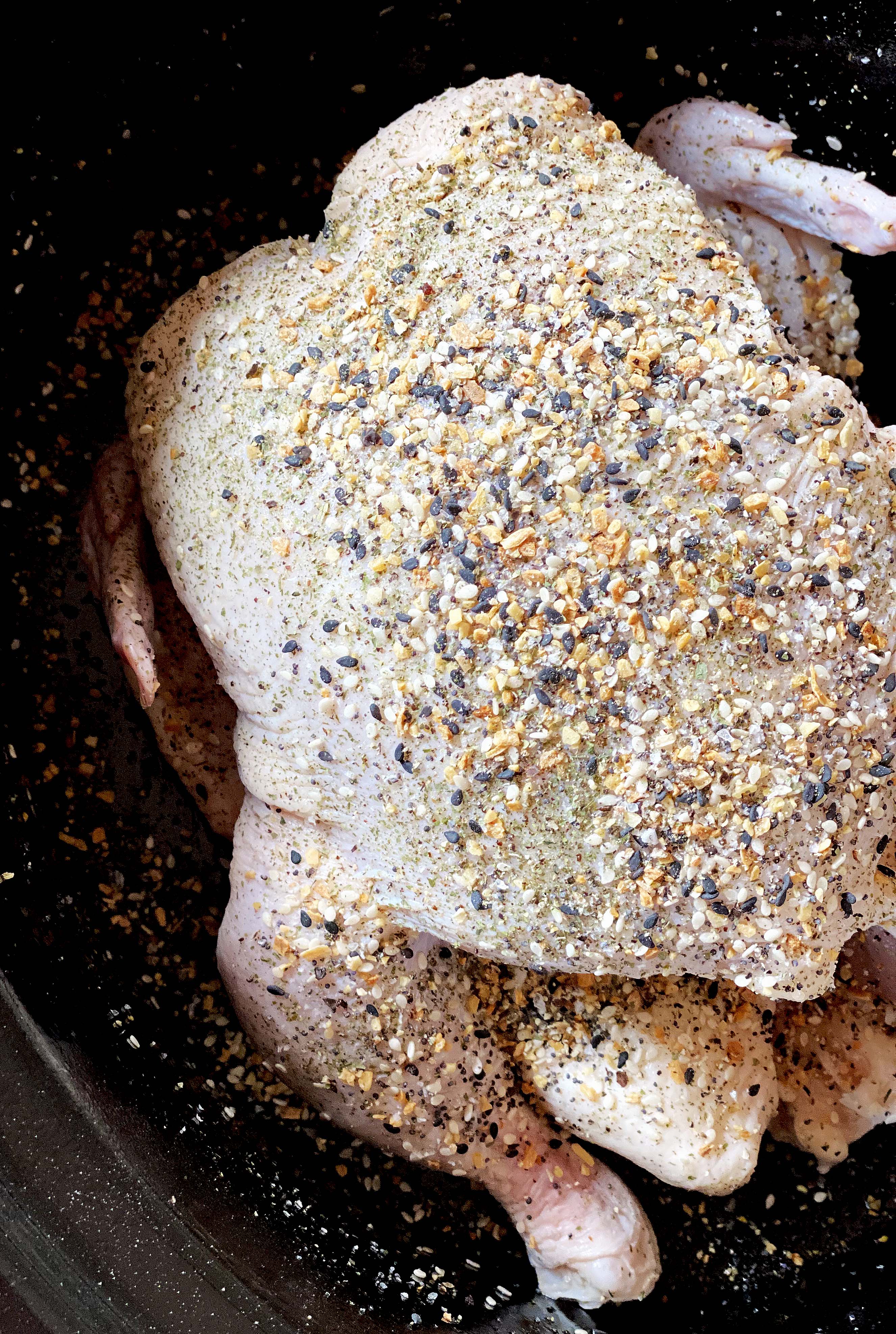 Season the chicken liberally inside and out with the EBTB seasoning. You can add salt and pepper to the chicken if desired. Go easy on the salt because the EBTB seasoning has salt in it.