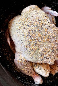 Remove chicken from slow cooker and season again if desired. The initial seasoning will be softened from the chicken juices. If you want the crunch of the seasoning, season once more.