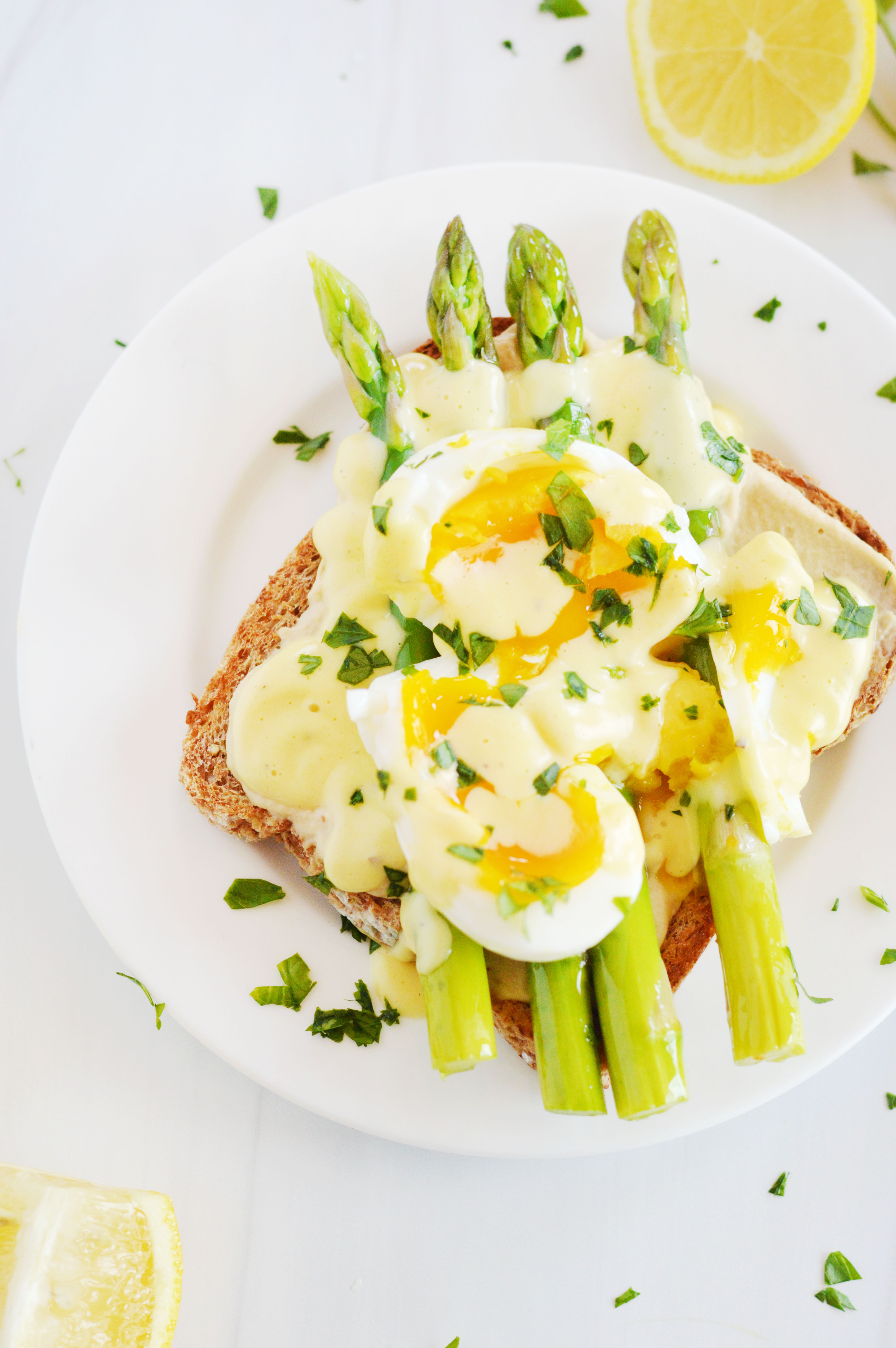 We happened to have some roasted garlic hummus in the fridge from our attempt to have healthier snacks, (dieting is going terribly btw) and it made the perfect canvas for the asparagus and the soft boiled egg. Then itโs topped with Hollandaise sauce which is made in the microwave (I know, I didnโt know it could be done either), and is the perfect velvety, rich and tangy touch to the healthy toast. Spring is served.