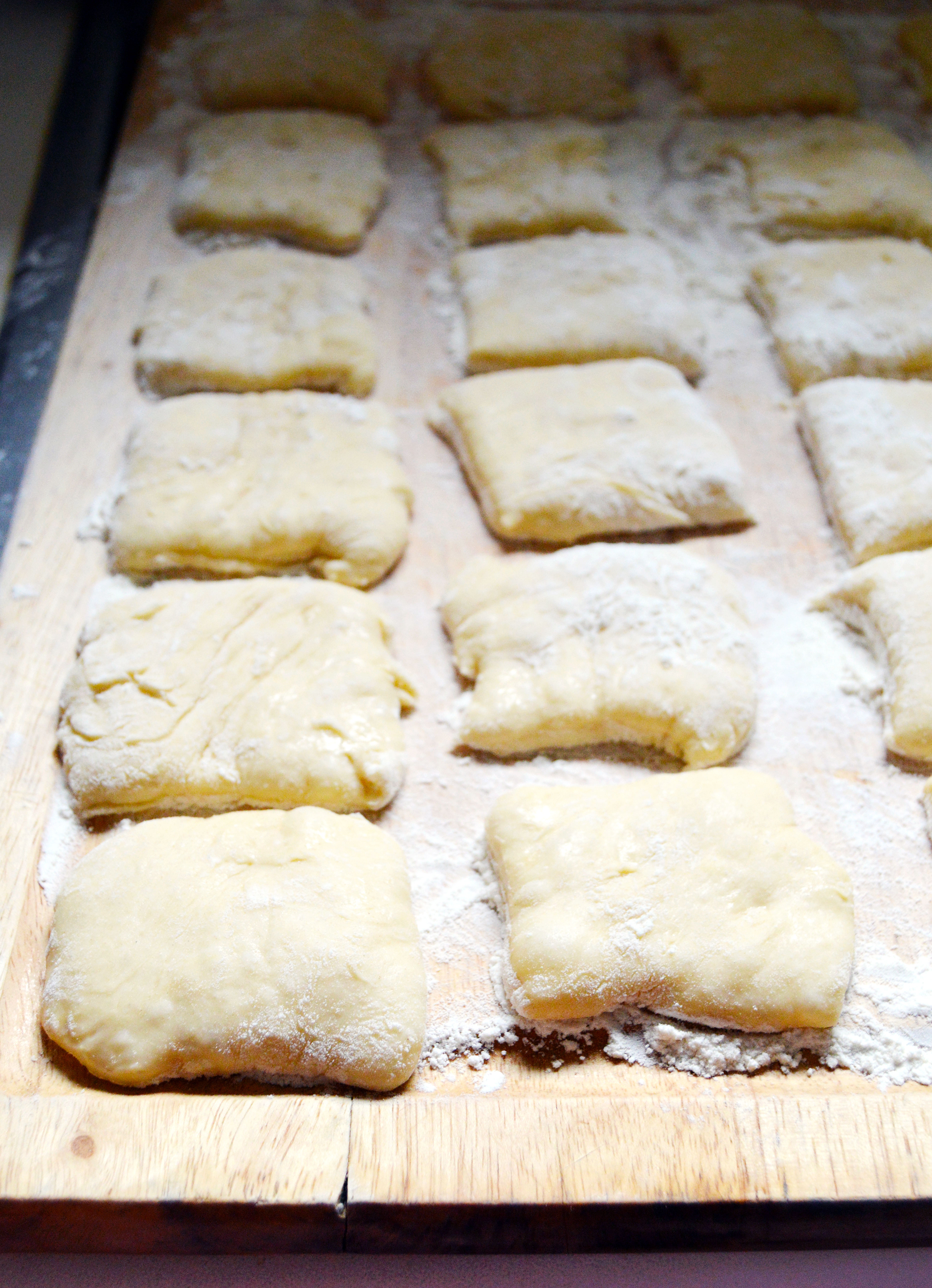 - On a large surface, generously coated with flour, dump out cold dough and roll out to a rectangle that is ¼ in. thick. Cut into 24 squares with a well lubed pizza cutter.