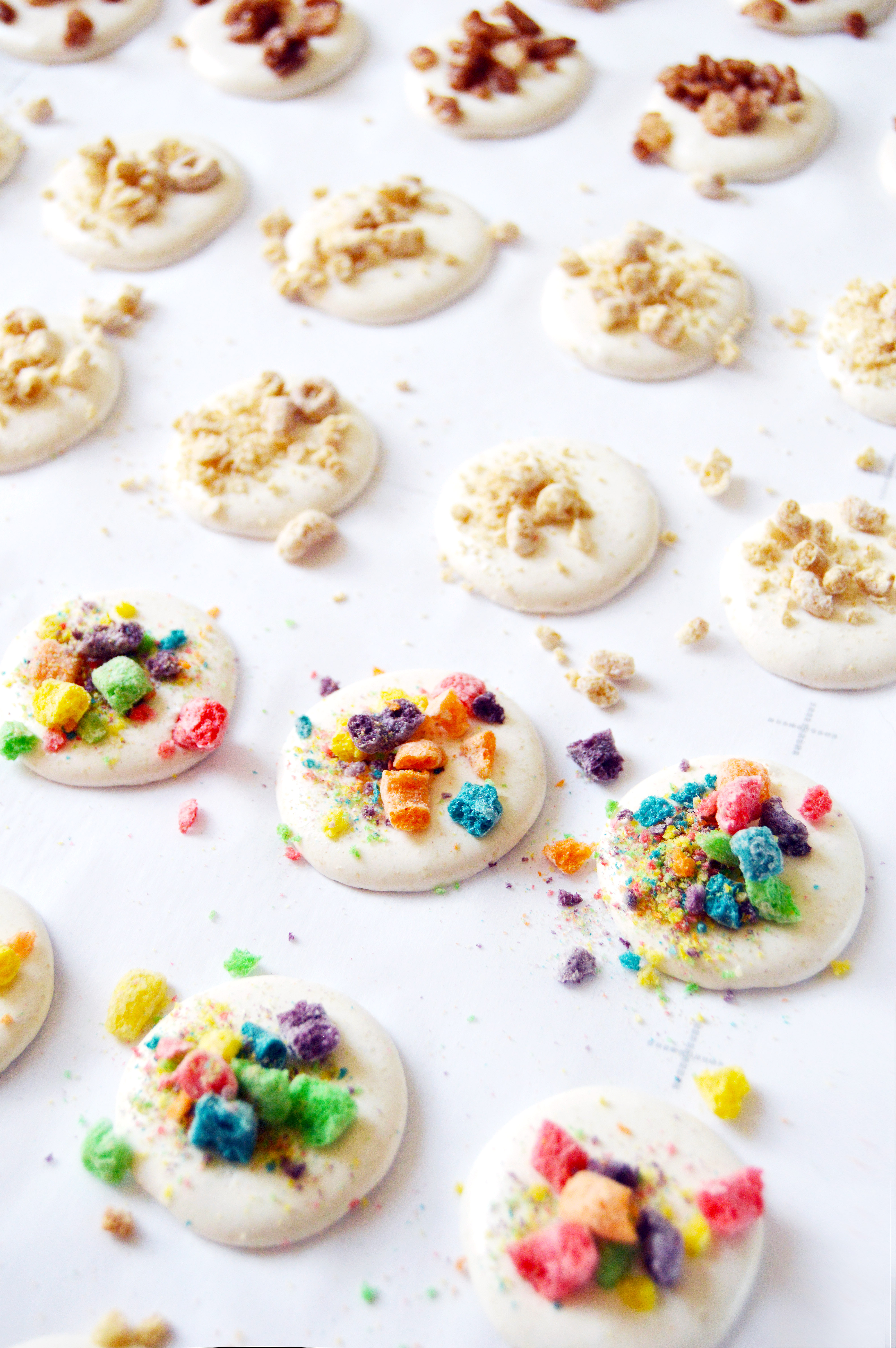 My absolute favorite part of the cake is the Lucky Charms bark I made from the marshmallows, different colors of candy melts and chock full of every kind of decorative sprinkle. You start off with a melted slab of white candy melt and swirl different colors of melted candy melts using a toothpick and then swipe along the top with an offset spatula. It blends beautifully and makes a watercolored candy bark. Then you pretty much go ham with however you want to top it. I think it’s important to restrain yourself when you do this so that you can still see the colors of the bark.