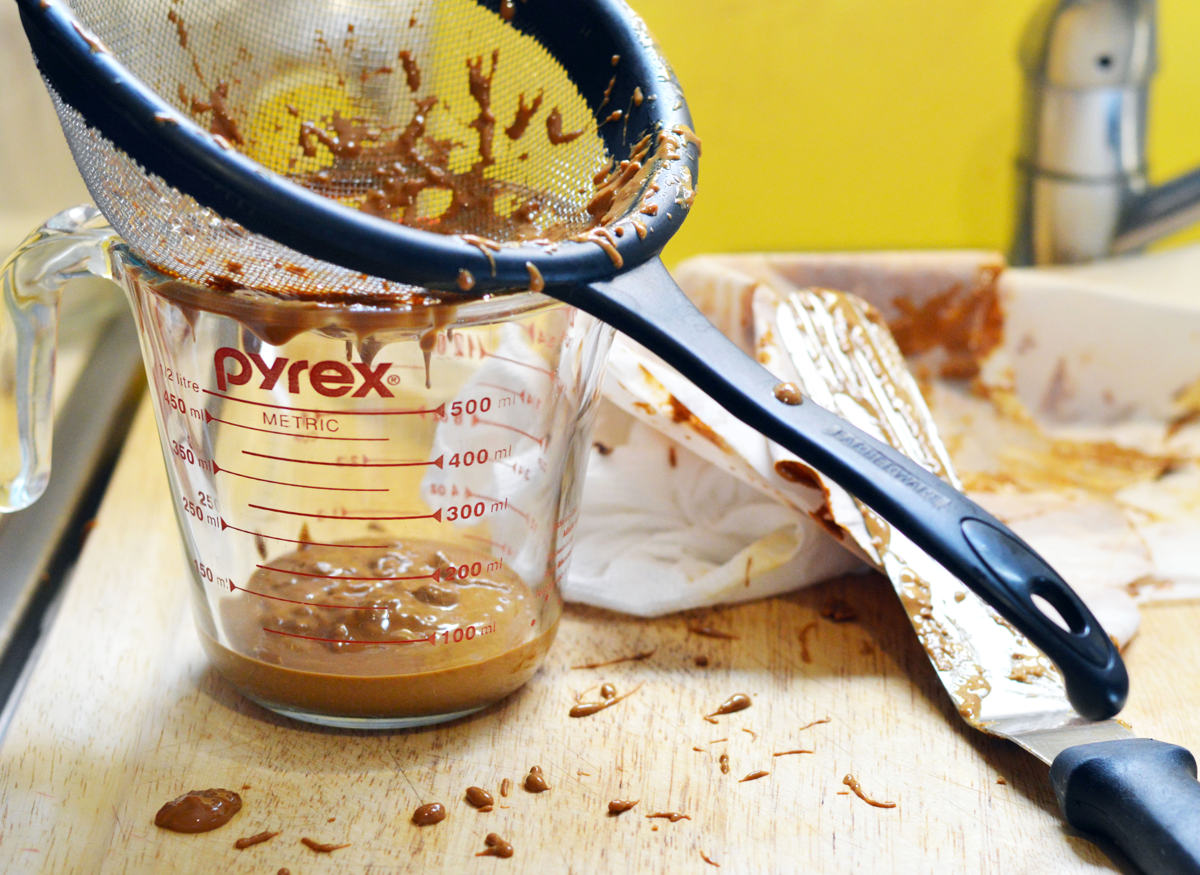 - Transfer the caramelized white chocolate into a heatproof bowl and let cool until thickened. Fold in the feuilletine flakes. Set aside. (See notes 4.)