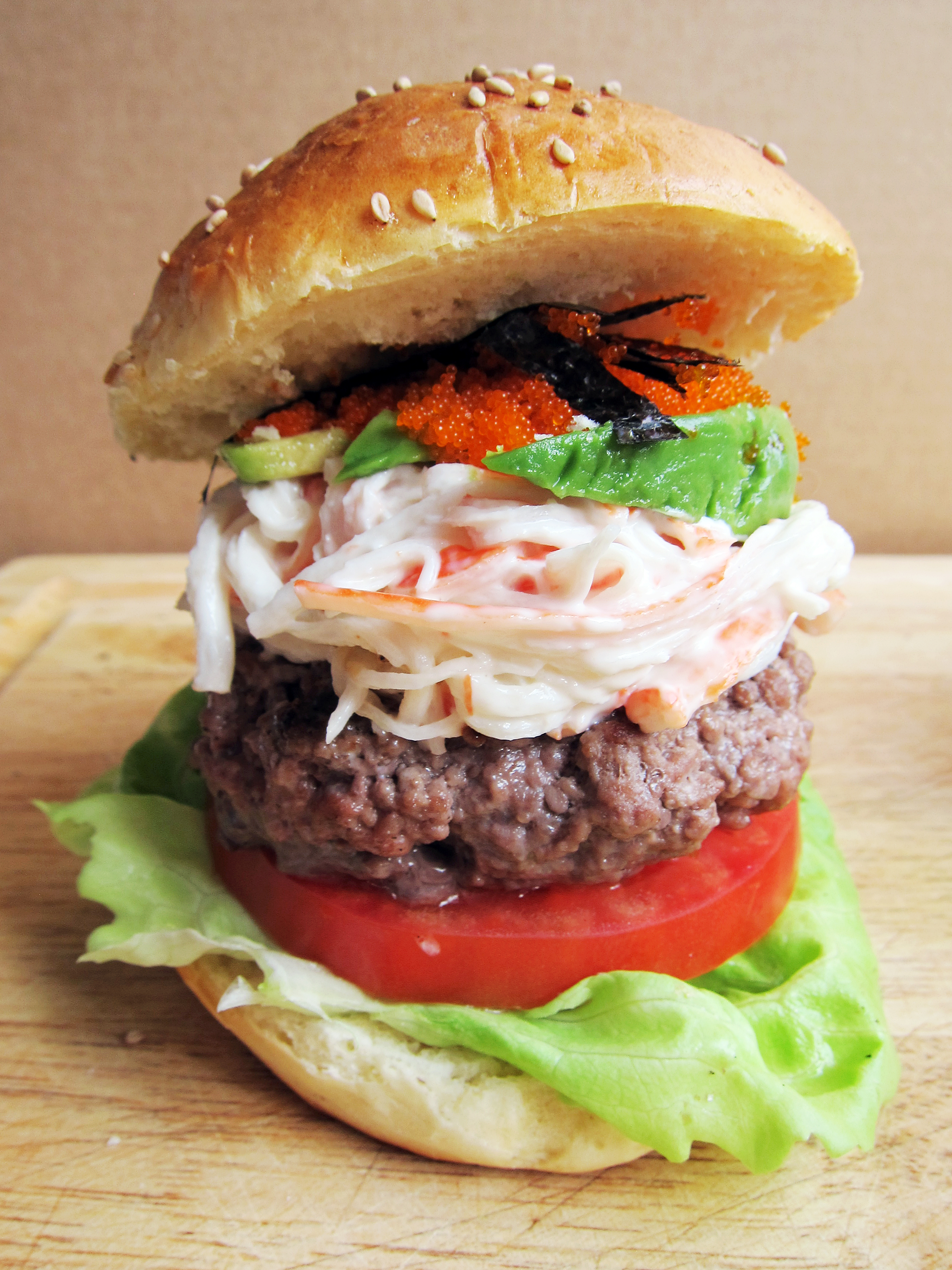 California Roll Burger 1It starts with a beautiful set of hamburger buns.* Followed by a spread of Sriracha mayo, and a stack of the standard lettuce and tomato.  The beef has just a dash of fish sauce for the umami factor and is topped with a light crab stick salad.  It is then followed by a few slices of avocado tossed in lime juice and topped with masago (smelt roe) and nori (dried seaweed).